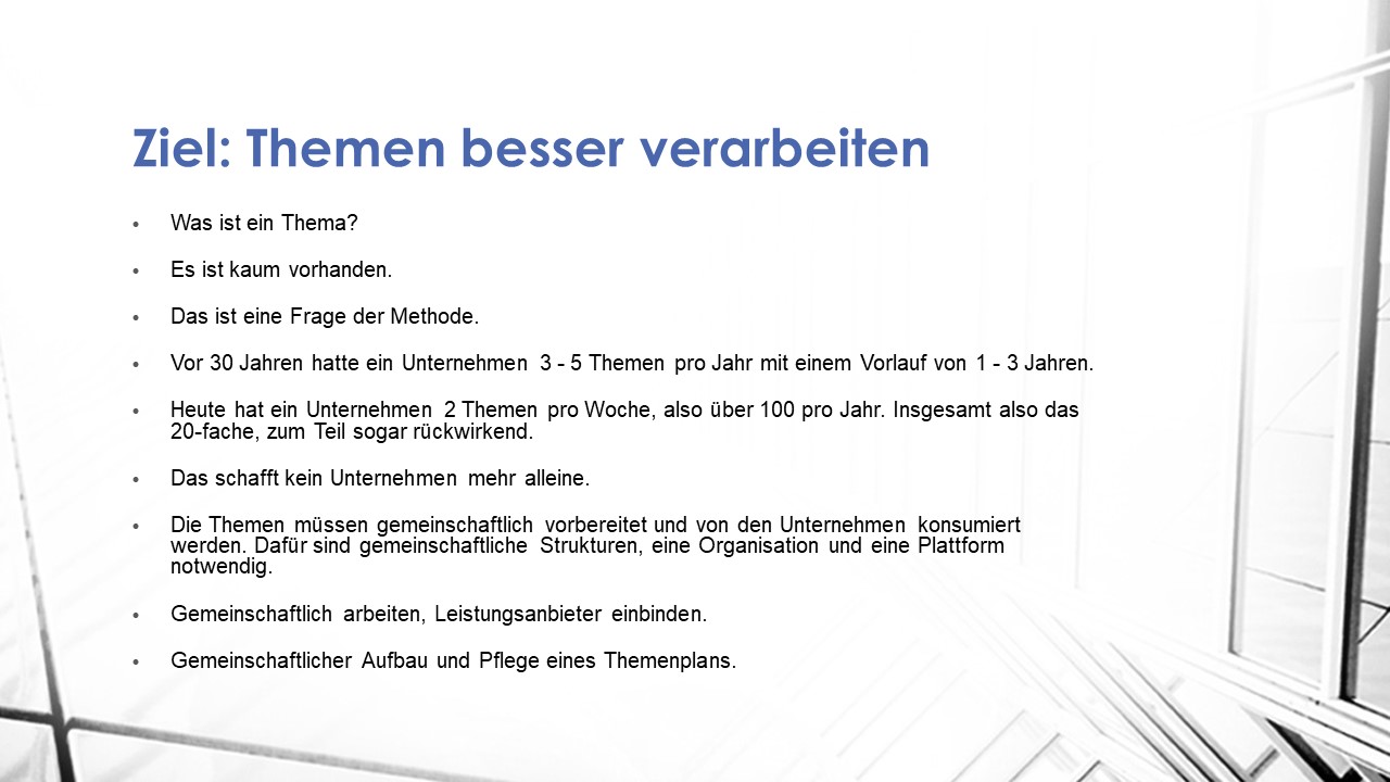 Die Themen müssen gemeinschaftlich vorbereitet und von den Unternehmen konsumiert werden. Dafür sind gemeinschaftliche Strukturen, eine Organisation und eine Plattform notwendig.