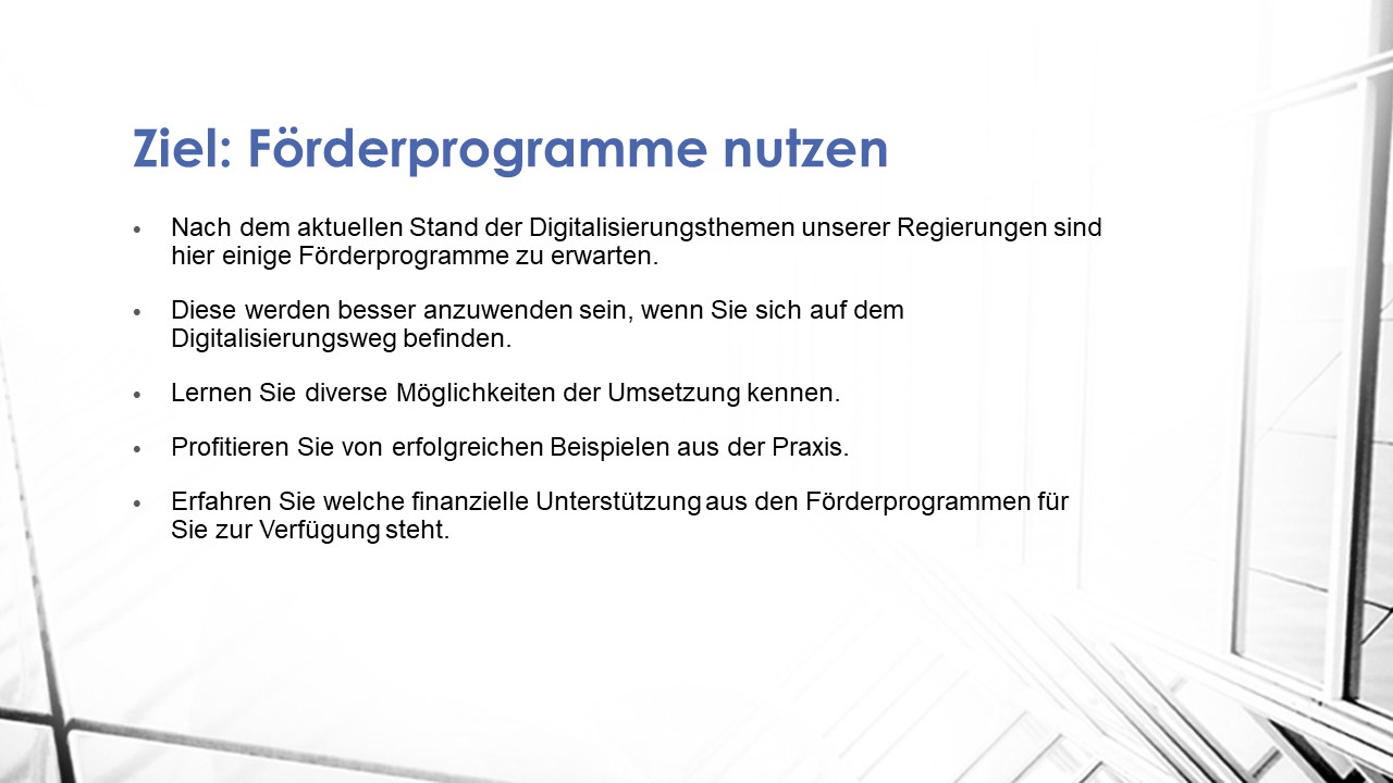 Nach dem aktuellen Stand der Digitalisierungsthemen unserer Regierungen sind hier einige Förderprogramme zu erwarten.